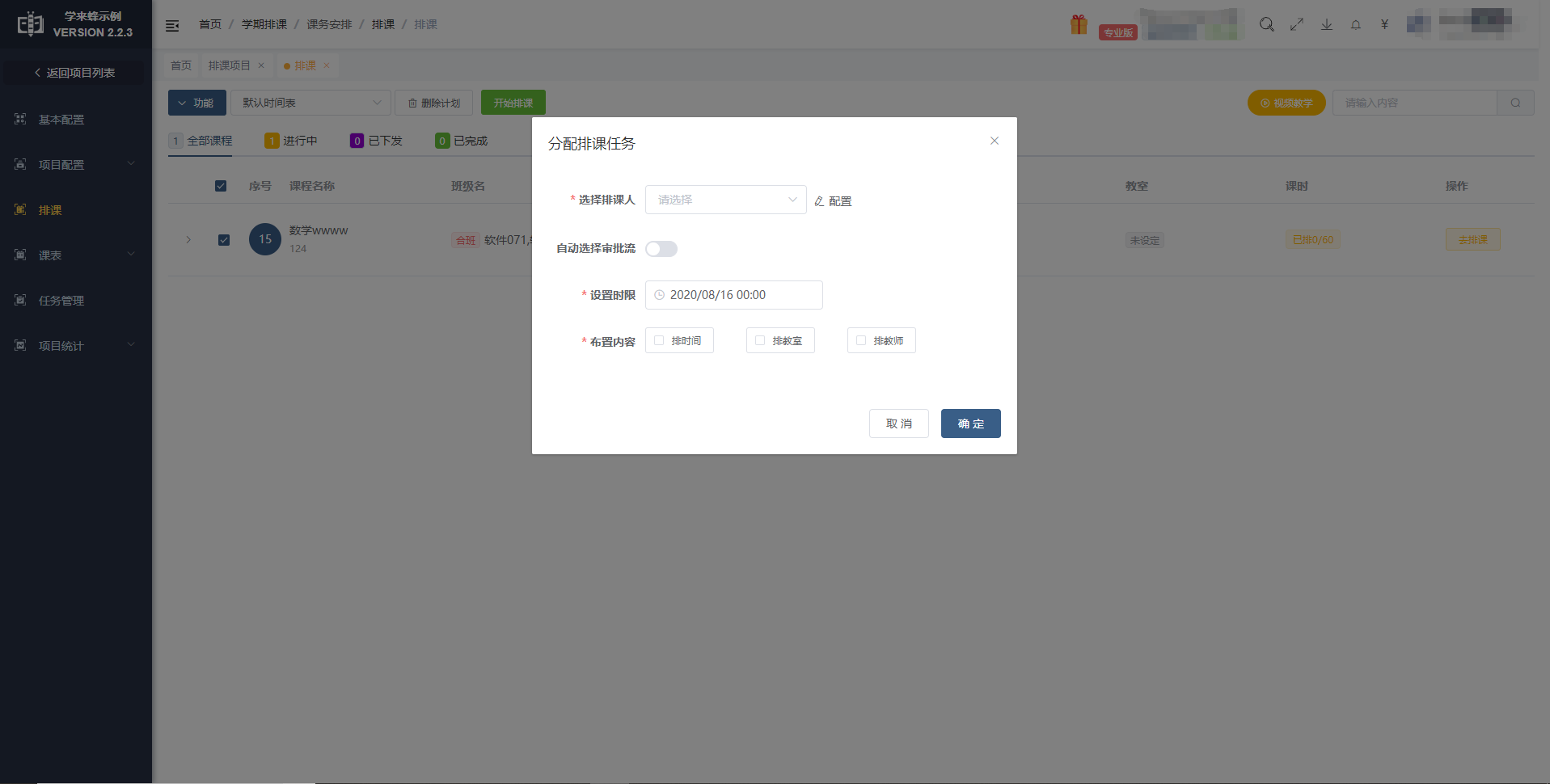 勾选课程信息,点击功能列表中的下发任务选项,弹出分配排课任务操作框,填写任务分配详情,点击提交按钮,完成下发排课任务操作。