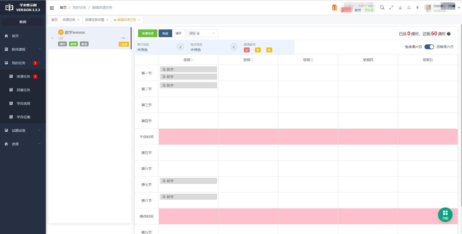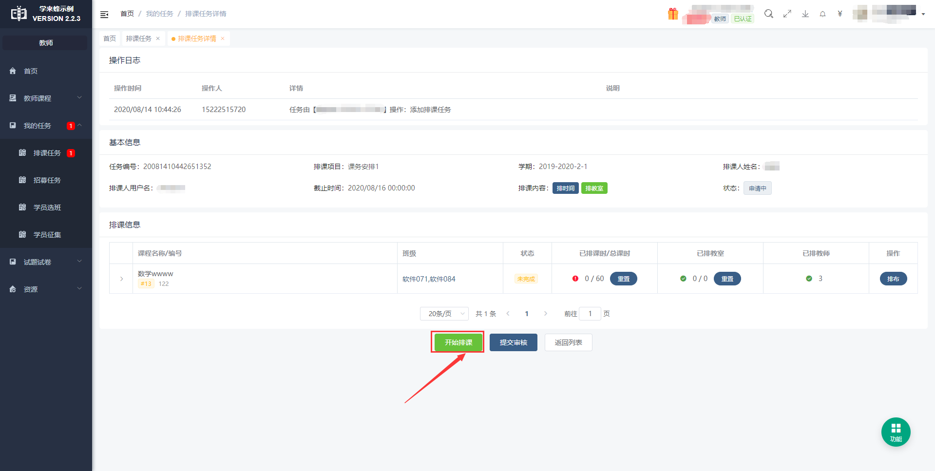 拥有排课任务的人员登陆自己的系统,点击我的任务按钮,选择排课任务选项,在排课任务页面中,点击每一个排课任务中的去排课按钮,进入排课信息介绍页面,点击开始排课按钮,进入排课页面进行排课操作。