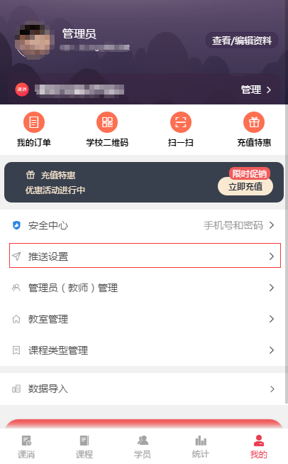 1、进入课消宝管理端小程序,点击我的-推送设置-自有公众号